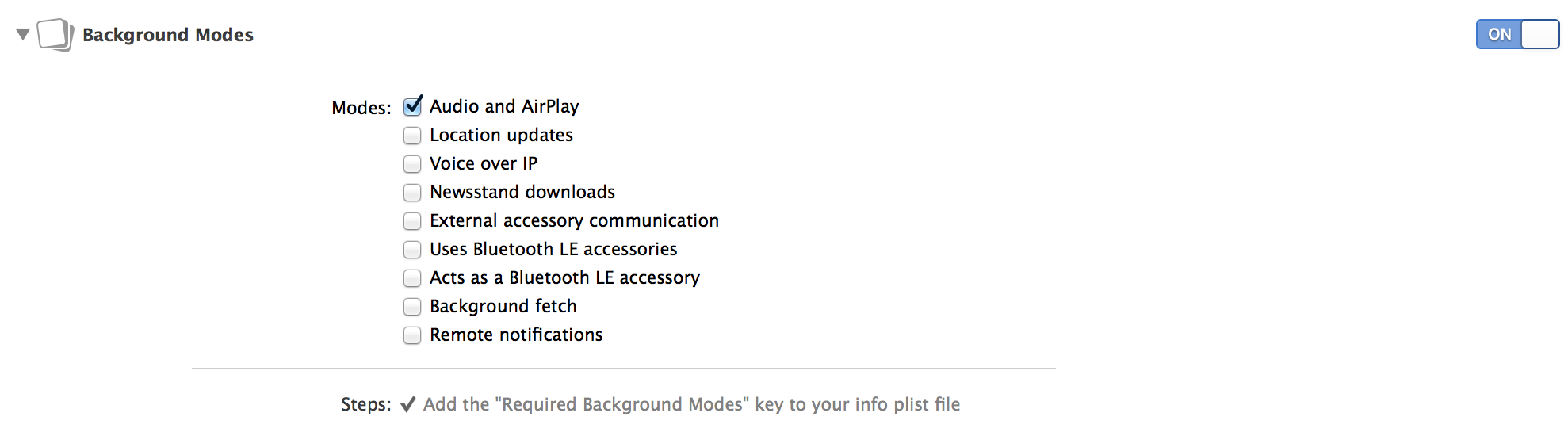 One last thing to do, select your application target in Xcode, in the Capabilities tab enable Audio and AirPlay checkbox inside Background Modes field. Applications without registered background playable can’t play or stream audio when app isn’t in foregrond or device locked.